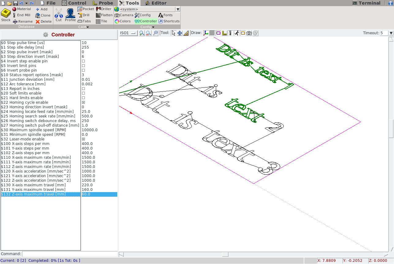 我成功地改变了 使用 MIN 10 和 MAX 1024(在我的身上!)效果很好。将它与 M4 S128(50% 负载 cicle,30 美元设置为 255)结合使用,它雕刻得很好,没有燃烧或弱点。 目前在生产中使用它。GRBL 是一个非常好的固件!? |
