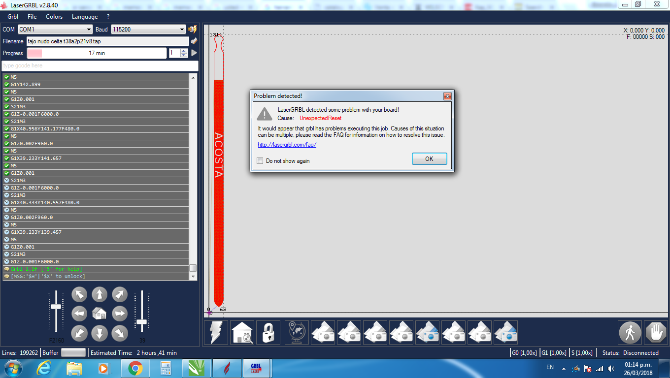 嗨 ,@sinfocomp,我想确定你知道这个系统是如何工作的。 如果在将线传输到机器时出现问题,通常这不是LaserGRBL本身的问题,而是硬件的问题。 在这种情况下,控制器板似乎进行了意外重置,LaserGRBL从您的板收到的Grbl 1.1f [$ for help]行也突出显示了这一点。 我猜不出是什么原因导致了这种意外的重置,可能是多个原因,但您必须在您的硬件上搜索原因。LaserGRBL只做了它的工作,检测到一些奇怪的事情发生,所以它不能完成它的任务,流文件。 |
