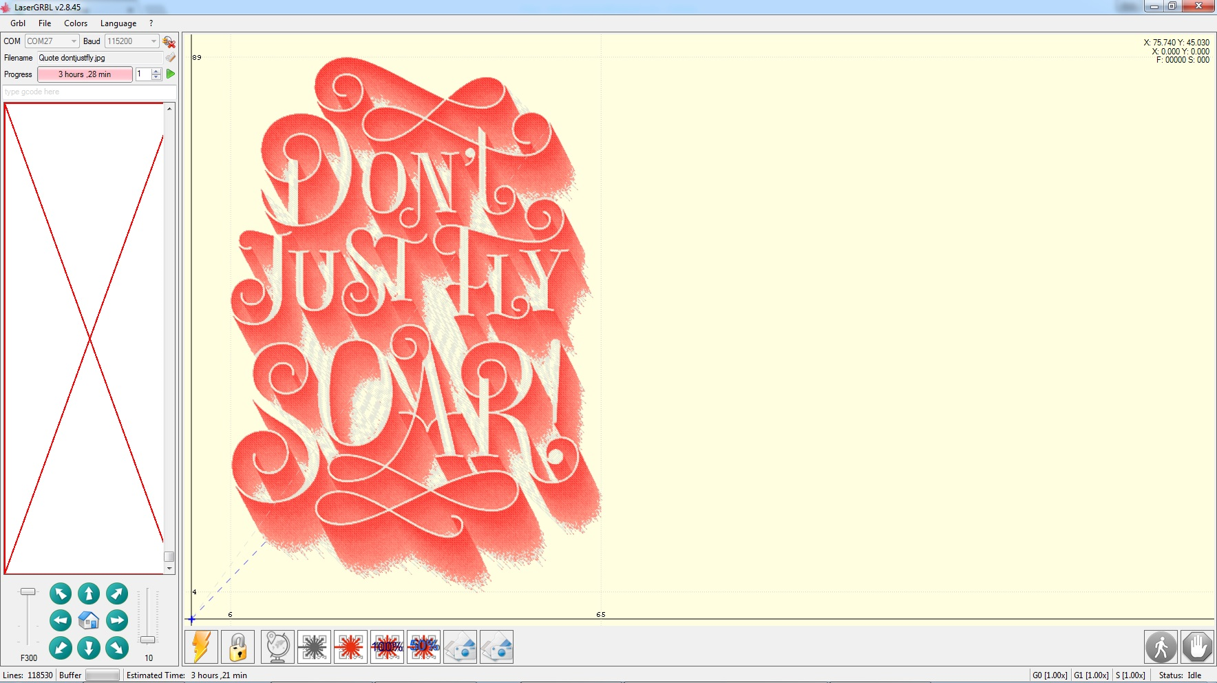 11/05/2018 2:39:45 PM OpenFile Open D:\ARD ESP PI stuff\CNC\NC Files\pics\Triumph-Motorcycles.jpg 11/05/2018 2:41:09 PM SetStatus Machine status [Jog] 11/05/2018 2:41:12 PM SetStatus Machine status [Idle] 11/05/2018 2:42:14 PM EnqueueProgram Running program, 262944 lines 11/05/2018 2:42:14 PM SetStatus Machine status [Run] 11/05/2018 3:46:39 PM ProgramEnd Job Executed: 27929 lines, 0 errors, 1 hour,9 min 11/05/2018 3:47:13 PM SetStatus Machine status [Idle] 11/05/2018 3:56:12 PM SendImmediate Send Immediate Command [0x9C] 11/05/2018 3:56:12 PM SendImmediate Send Immediate Command [0x9C] 11/05/2018 3:56:13 PM SendImmediate Send Immediate Command [0x9C] 11/05/2018 3:56:13 PM SendImmediate Send Immediate Command [0x9C] 11/05/2018 3:56:13 PM SendImmediate Send Immediate Command [0x9C] 11/05/2018 3:56:13 PM SendImmediate Send Immediate Command [0x9C] 11/05/2018 3:56:16 PM SendImmediate Send Immediate Command [0x9C] 11/05/2018 3:56:16 PM SendImmediate Send Immediate Command [0x9C] 11/05/2018 3:56:16 PM SendImmediate Send Immediate Command [0x9C] 11/05/2018 3:56:16 PM SendImmediate Send Immediate Command [0x9C] 11/05/2018 3:56:16 PM SendImmediate Send Immediate Command [0x9C] 11/05/2018 3:56:22 PM SendImmediate Send Immediate Command [0x92] 11/05/2018 3:56:23 PM SendImmediate Send Immediate Command [0x94] 11/05/2018 3:56:23 PM SendImmediate Send Immediate Command [0x92] 11/05/2018 3:56:23 PM SendImmediate Send Immediate Command [0x94] 11/05/2018 3:56:23 PM SendImmediate Send Immediate Command [0x94] 11/05/2018 3:56:25 PM SendImmediate Send Immediate Command [0x94] 11/05/2018 3:56:25 PM SendImmediate Send Immediate Command [0x94] 11/05/2018 3:56:25 PM SendImmediate Send Immediate Command [0x94] 11/05/2018 3:56:25 PM SendImmediate Send Immediate Command [0x94] 11/05/2018 3:56:26 PM SendImmediate Send Immediate Command [0x94] 11/05/2018 3:56:26 PM SendImmediate Send Immediate Command [0x94] 11/05/2018 3:56:29 PM EnqueueProgram Running program, 27929 lines 11/05/2018 3:56:29 PM SetStatus Machine status [Run] 11/05/2018 5:11:20 PM ProgramEnd Job Executed: 27929 lines, 0 errors, 1 hour,14 min 11/05/2018 5:11:54 PM SetStatus Machine status [Idle] 11/05/2018 5:43:08 PM SendImmediate Send Immediate Command [0x9C] 11/05/2018 5:43:08 PM SendImmediate Send Immediate Command [0x9C] 11/05/2018 5:43:08 PM SendImmediate Send Immediate Command [0x9C] 11/05/2018 5:43:08 PM SendImmediate Send Immediate Command [0x9C] 11/05/2018 5:43:08 PM SendImmediate Send Immediate Command [0x9C] 11/05/2018 5:43:09 PM SendImmediate Send Immediate Command [0x9C] 11/05/2018 5:43:09 PM SendImmediate Send Immediate Command [0x9C] 11/05/2018 5:43:09 PM SendImmediate Send Immediate Command [0x9C] 11/05/2018 5:43:09 PM SendImmediate Send Immediate Command [0x9C] 11/05/2018 5:43:10 PM SendImmediate Send Immediate Command [0x9C] 11/05/2018 5:43:10 PM SendImmediate Send Immediate Command [0x9C] 11/05/2018 5:43:10 PM SendImmediate Send Immediate Command [0x9C] 11/05/2018 5:43:12 PM SendImmediate Send Immediate Command [0x94] 11/05/2018 5:43:12 PM SendImmediate Send Immediate Command [0x94] 11/05/2018 5:43:13 PM SendImmediate Send Immediate Command [0x94] 11/05/2018 5:43:13 PM SendImmediate Send Immediate Command [0x94] 11/05/2018 5:43:13 PM SendImmediate Send Immediate Command [0x94] 11/05/2018 5:43:13 PM SendImmediate Send Immediate Command [0x94] 11/05/2018 5:43:14 PM SendImmediate Send Immediate Command [0x94] 11/05/2018 5:43:14 PM SendImmediate Send Immediate Command [0x94] 11/05/2018 5:43:14 PM SendImmediate Send Immediate Command [0x94] 11/05/2018 5:43:14 PM SendImmediate Send Immediate Command [0x94] 11/05/2018 5:43:14 PM SendImmediate Send Immediate Command [0x92] 11/05/2018 5:43:15 PM SendImmediate Send Immediate Command [0x94] 11/05/2018 5:43:15 PM SendImmediate Send Immediate Command [0x94] 11/05/2018 5:43:15 PM SendImmediate Send Immediate Command [0x94] 11/05/2018 5:43:15 PM SendImmediate Send Immediate Command [0x94] 11/05/2018 5:43:21 PM SetStatus Machine status [Jog] 11/05/2018 5:43:25 PM SetStatus Machine status [Idle] 11/05/2018 5:43:28 PM SetStatus Machine status [Jog] 11/05/2018 5:43:32 PM SetStatus Machine status [Idle] 11/05/2018 5:43:37 PM SetStatus Machine status [Jog] 11/05/2018 5:43:40 PM SetStatus Machine status [Idle] 11/05/2018 5:43:58 PM SetStatus Machine status [Jog] 11/05/2018 5:44:05 PM SetStatus Machine status [Idle] 11/05/2018 5:44:11 PM EnqueueProgram Running program, 27929 lines 11/05/2018 5:44:11 PM SetStatus Machine status [Run] 11/05/2018 7:05:57 PM ProgramEnd Job Executed: 27929 lines, 0 errors, 1 hour,21 min 11/05/2018 7:06:31 PM SetStatus Machine status [Idle]