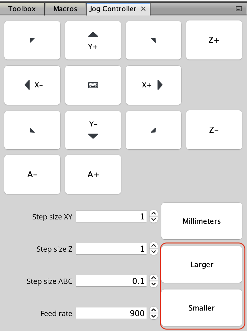 请将 Z 点动距离设置与 X 和 Y 设置分开。所以当设置了 X 和 Y 时 Z 不会改变。问题是单击 X 和 Y 的“较大”设置时,Z 设置最多可以跳到 100 mm。这会导致 Z 轴崩溃。现在的情况是,在更改 X 轴和 Y 轴后,我不断将 Z 设置改回 1-10 毫米。这是一种不安全的设置方式。Z 轴点动设置应与 X、Y 设置完全分开。