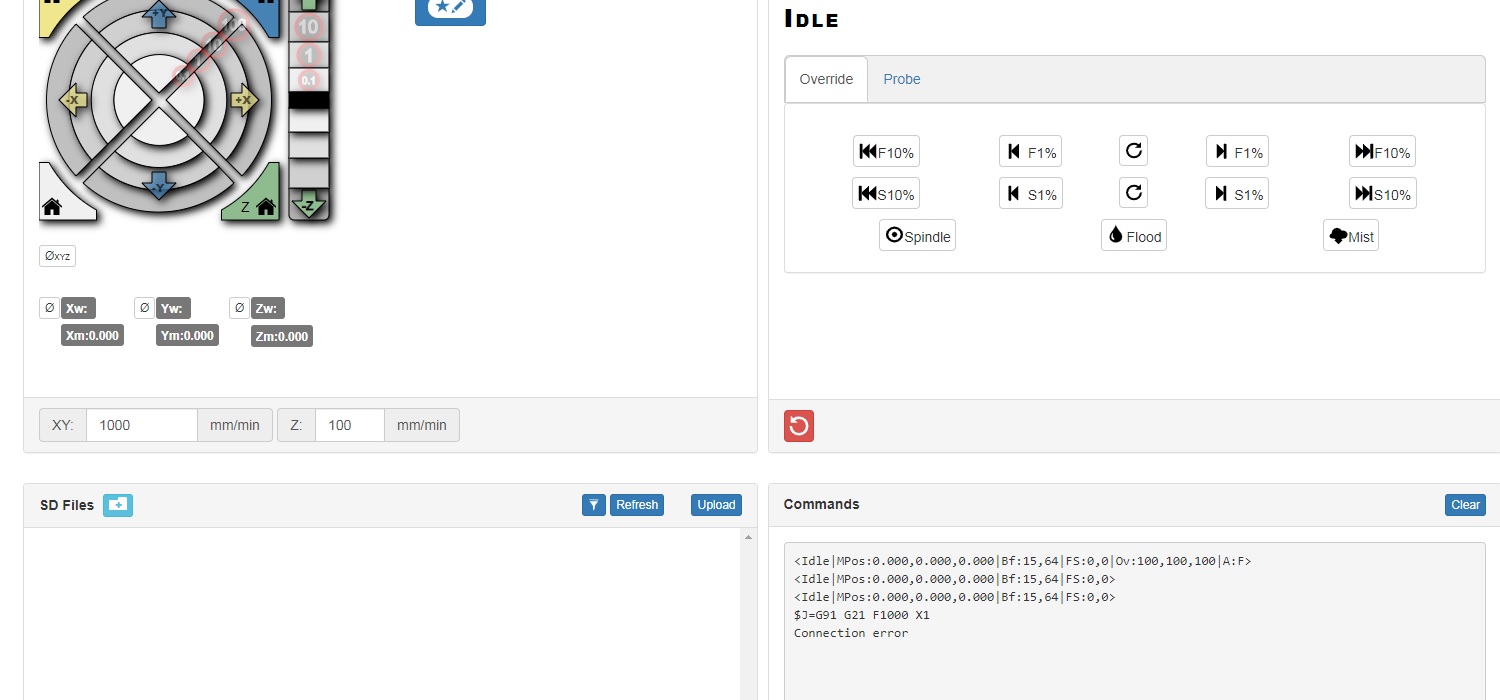 刚刚完成电路板并使用 ESP32_GRBL v1.2a 刷新了 esp32s。为 GRBL ESP32 UI 2.1b61 上传了 ESP3D,我认为它是最新版本,但它不起作用。在我尝试移动任何电机之前,我会在详细模式下看到传入的命令,电机不会移动并且命令停止到达,有时只是一段时间,有时是永久的,然后是连接错误消息。除非我也将 USB 插入 ESP32 并运行 UGS 并连接……然后一切似乎都可以正常工作(不……我不是在开玩笑,而且它是完全可重复的)。