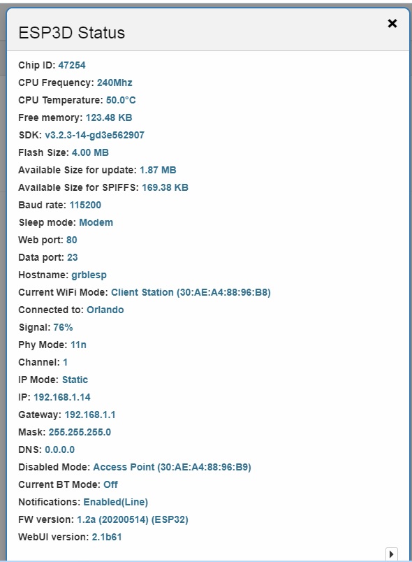 感谢您的回复 Bart,硬件 – JLCPCB 的 ESP32s PCB 来自您的 gerbers 3x drv8825 3xNEMA17 的 Arduino 串行监视器的启动文本 – ets 2016 年 6 月 8 日 00:22:57 rst:0x1 (POWERON_RESET),boot:0x13 (SPI_FAST_FLASH_BOOT) configsip: 0,SPIWP:0xee clk_drv:0x00,q_drv:0x00,d_drv:0x00,cs0_drv:0x00,hd_drv:0x00,wp_drv:0x00 模式:DIO,时钟 div:1 负载:0x3fff0018,len:4 负载:0x3fff001c,len:1044 load:0x40078000,len:8896 load:0x40080400,len:5816 条目 0x400806ac [MSG:Grbl_ESP32 Ver 1.2a Date 20200514] [MSG:Compiled with ESP32 SDK:v3.2.3-14-gd3e562907] [MSG:Using machine:PLOWRIDER_2] [MSG:Axis count 3] [MSG:RMT Steps] [MSG:PWM spindle Output:16, Enbl:32, Dir:-1, Freq:5000Hz, Res:13bits] [MSG:Client Started] [MSG:Connecting Orlando ] [MSG:Connecting.] [MSG:Connecting..] [MSG:Connected with 192.168.1.14] [MSG:Connected with 192.168.1.14] [MSG:使用主机名启动 mDNS:http://grblesp.local/有时,详细窗口只会冻结几秒钟……可能 20 秒左右,然后消息继续。任何时候步进电机都不会接合。ESP32 已经通过 USB 连接,因为我使用 Arduino 串行监视器观看串行通信,但如果我让 USB 断开连接,问题是一样的)。如果我然后打开通用 Gcode 发送器并通过 USB 连接,我可以同时从 UGS 和通过 wifi 链接正常操作 ESP32,没有问题。在尝试移动任何步进器之前,附上 ESP3D 状态屏幕截图和刚启动后的 UI。谢谢你的帮助问候迈克 ESP32 已经通过 USB 连接,因为我使用 Arduino 串行监视器观看串行通信,但如果我让 USB 断开连接,问题是一样的)。如果我然后打开通用 Gcode 发送器并通过 USB 连接,我可以同时从 UGS 和通过 wifi 链接正常操作 ESP32,没有问题。在尝试移动任何步进器之前,附上 ESP3D 状态屏幕截图和刚启动后的 UI。谢谢你的帮助问候迈克 ESP32 已经通过 USB 连接,因为我使用 Arduino 串行监视器观看串行通信,但如果我让 USB 断开连接,问题是一样的)。如果我然后打开通用 Gcode 发送器并通过 USB 连接,我可以同时从 UGS 和通过 wifi 链接正常操作 ESP32,没有问题。在尝试移动任何步进器之前,附上 ESP3D 状态屏幕截图和刚启动后的 UI。谢谢你的帮助问候迈克