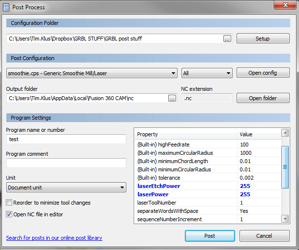 那太棒了!融合中激光编程的问题之一是当您发布程序时,后处理器失败并抱怨不支持激光切割。不确定除此之外是否需要进行任何其他更改。 有一个 smoothie 后处理器可以输出激光代码,但我必须进入并编辑代码才能使其工作。我似乎记得有问题没有发布激光移动的进给率。我会查看 smoothie 帖子,看看他们做了什么,然后将激光代码添加到您的 grbl 帖子中。 http://cam.autodesk.com/posts/post.php?name=smoothie 我有一个项目要尽快削减,所以如果你愿意,我可以测试一下! |