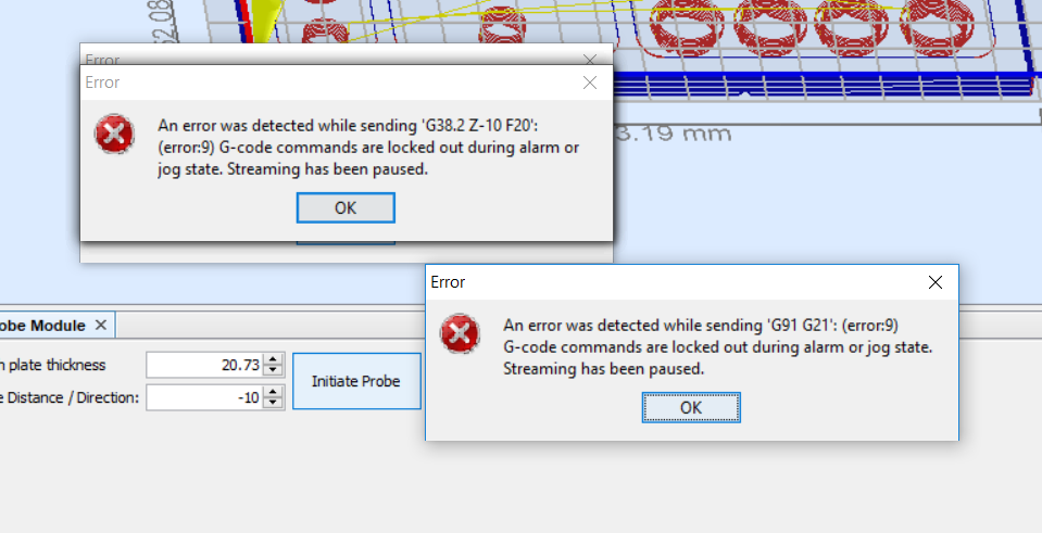 我使用 STM103(源代码)而不使用 Arduino 作为 grbl 的控制器。当我将探测针接地时,错误消失,我可以开始探测了。