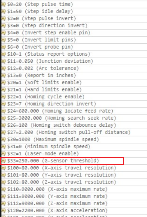 是的,这是 g-shock 阈值。 我和 Ortur 谈了一会儿,他们说这个值不应该被用户更改,因为它指的是安全功能(确切地说是 g-shock)。Ortur 故意不记录它,更重要的是那些 gnea / grbl 的人对此一无所知。在 LaserGRBL 中,我将其记录为“G-Sensor threshold”。 我没有关于此的更多信息(测量单位或物理意义),但必须按制造商的声明保留原样。 |