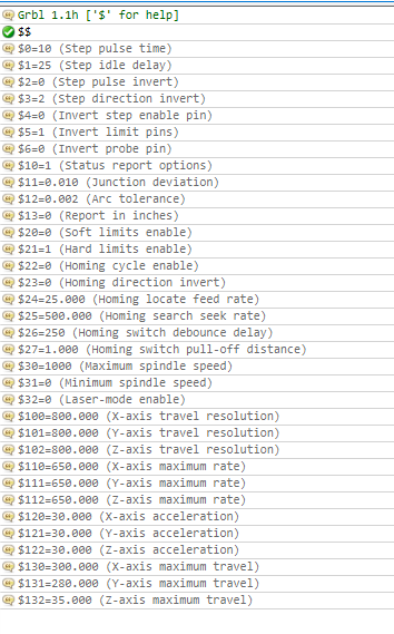 我在 1.1h 上遇到了同样的问题。我在正确的位置(在 config.h 文件的 Arduino 库副本中)进行了更改,当我在 Arduino IDE 中运行 Verify 时,我注意到编译的大小稍大,定义了 HOMING_SINGLE_AXIS_COMMANDS 变量,告诉我它实际上应该被识别为已更改。 使用 LaserGRBL,我在尝试运行 $HX、$HY 或 $HZ 时仍然收到“设置已禁用”错误。 GRBL 设置: 编辑:更正,我刚刚注意到 Homing Cycle($22)被禁用,启用它允许运行所述命令!)但是手动触发我的开关并没有停止机器,我在它命中之前拔下了插头。 为了完整起见:我还注释掉了 (Disabled) HOMING_INIT_LOCK,以避免默认锁定。我的限位开关也配置为常闭。我将 3018 CNC 与 Woodpecker 3.4 板一起使用。 编辑 2:我想我在这里发现了问题:#217(评论)看起来像 NC 开关,轴的两个开关需要相互串联,而不是连接到它们自己的引脚,因为它们是 1 个电路. 这应该可以解决我所有的问题,希望也能解决你的问题@arminlinder 编辑 3:Welp,还有 1 个问题。我所有的限位开关现在都可以正常工作,因为当我按下它们时它们会触发停止,需要重置和解锁。但是,它们在归巢序列期间不起作用。除非我在设置中遗漏了一些东西,否则我唯一的猜测就是电气干扰。然而,我不认为这是手动点动和触发开关成功停止的情况,所以它只在归位序列期间它们不工作。 编辑 4:Annnd 它看起来像 X 和 Z 限制销被错误标记,它们是向后的,归位 $HX 并触发 Z 开关做到了。奇怪的是,我希望任何一个开关都能触发停止。所以看起来这为我解决了所有问题,希望你也一样。 |