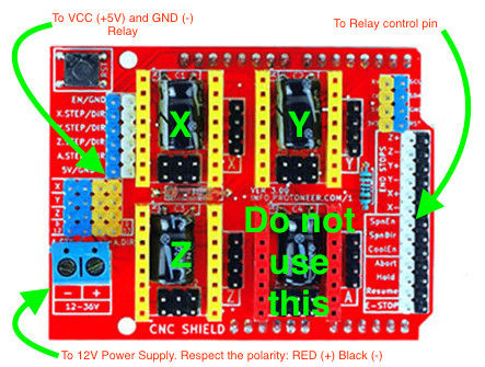该屏蔽适用于 grbl 0.8 版本,在 grbl 0.9 及更高版本上,引脚 11 和 12 之间发生了变化,您可以调整该屏蔽以与 grbl 0.9 或 1.1 一起使用,您需要交换引脚,一种方法是您弯曲屏蔽层上的引脚 11 和 12,然后将带有母头的电缆连接到它们上,并将另一侧焊接到 arduino 的底部,因此屏蔽层的引脚 11 焊接到 arduino 的 12 和屏蔽层的 12你焊接到arduino的11 您可以在此页面中看到从 0.8 版引出线和 0.9 版引出线所做的更改 盾牌上的 SpnEn 是您连接继电器的地方。 |