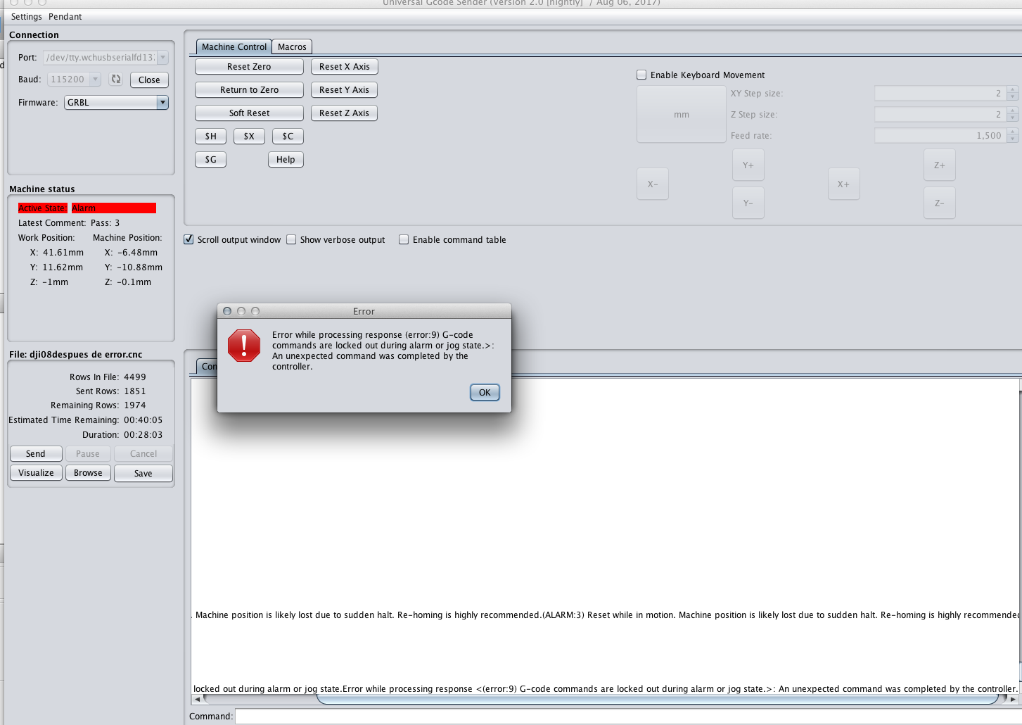 我已经通过 GRBL V1.1 我的问题是其他的 我不仅更改了 Grbl v.1.1,还更改了步进驱动程序,但我似乎没有达到最佳配置,我尝试更改所有内容 我的电机 Nema32 我的驱动程序 4A TB6600 微步 2/B 400 电流(A) 2.0 我的参数 我遇到的最常见的问题是,当机器切割时,自动进入暂停并自动重新启动 当我手动更改主轴速度时 grbl 进入暂停 但是暂停的那个并没有那么严重……最糟糕的问题是当他向我发送错误时,这让我发疯,我无法准确无误地剪下一块。为了解决这个错误,我必须从零开始一切 这意味着我失去了机器的位置并且很难手动再次找到点 0 这让我在垃圾桶里损失了很多切割得很糟糕的碎片和碳板 |