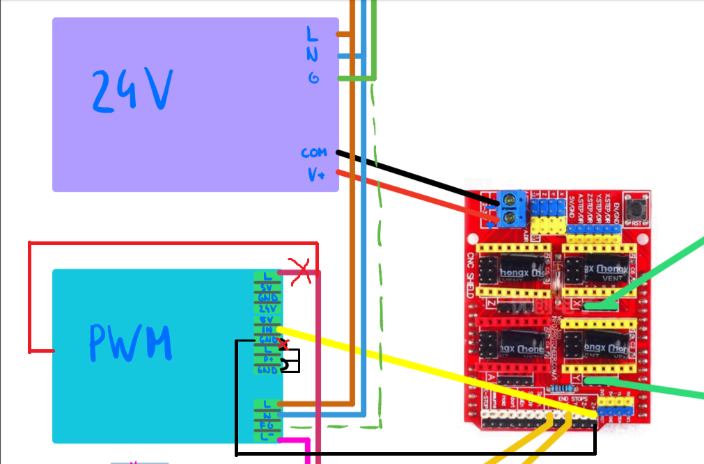 Estou tentando colocar o Arduino com CNC Shield em minha máquina a laser。Porem se eu conectar o IN eo G no Shield o laser não funciona。Alguém poderia me ajudar a montar um esquema para montar esta fonte no Shield?我正在尝试将带有 CNC Shield 的 Arduino 放在我的激光机上。但是,如果我将 IN 和 G 连接到 Shield,激光器将无法工作。有人可以帮我制定一个方案,将这种字体安装到 Shield 上吗? |