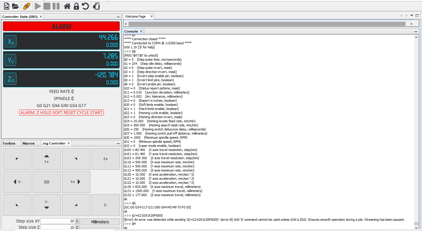 我登录是为了问完全相同的问题。这也可能是我的原始帖子! 附件是 UGS 中显示的警报和 GRBL 设置的屏幕截图。我看到这是 13 天前被问到的…有人知道我们在这里可能面临什么吗?运行设置向导时所有电机和轴都工作,我已经成功校准了运动。但是一旦我启用归位和限位开关,我就会收到警报 1 限位开关警报。检查所有开关(它们是 NC 开关)并且所有开关都正常工作且接线正确。我一直追踪到电路板的接线,所有接线都正常工作。开关工作,但 Z 轴在启用它们时立即标记错误。触发 x 和 y 按计划工作。而且,正如您在图片中看到的,x 轴和 y 轴为绿色,布线设置与 z 轴相同。 随附的是 config.h 文件,因为我试图在那里寻找答案,并且在第一次脸红时事情不起作用时一路进行了更改。您也可以在附图中看到我的 GRBL 设置。任何对此的帮助将不胜感激,因为机器终于可以使用了,但是软件设置抛出了这个错误。我在用: