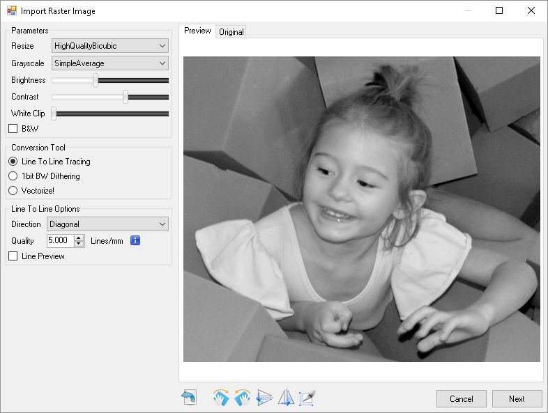 最新版本中没有添加任何可能导致此问题的内容。 白色剪辑的功能允许您设置一个白点阈值,将从零到稳定白点的任何白色值转换为“纯白色”。 这对于专门从网络下载的黑白徽标可能很有用,有时由于 jpg 压缩或图像质量低,白色不是 RGB 255、255、255,而是非常浅的灰色,如 254、253、254。在这种情况下,白色剪辑消除了这种噪音并防止激光以非常低的功率浪费时间燃烧该区域。 对于图片,白色剪辑应保留为零。 单击并拖动“白色剪辑”选择器时剪辑预览将显示为粉红色,并在释放时消失。 |