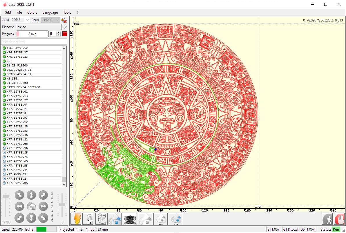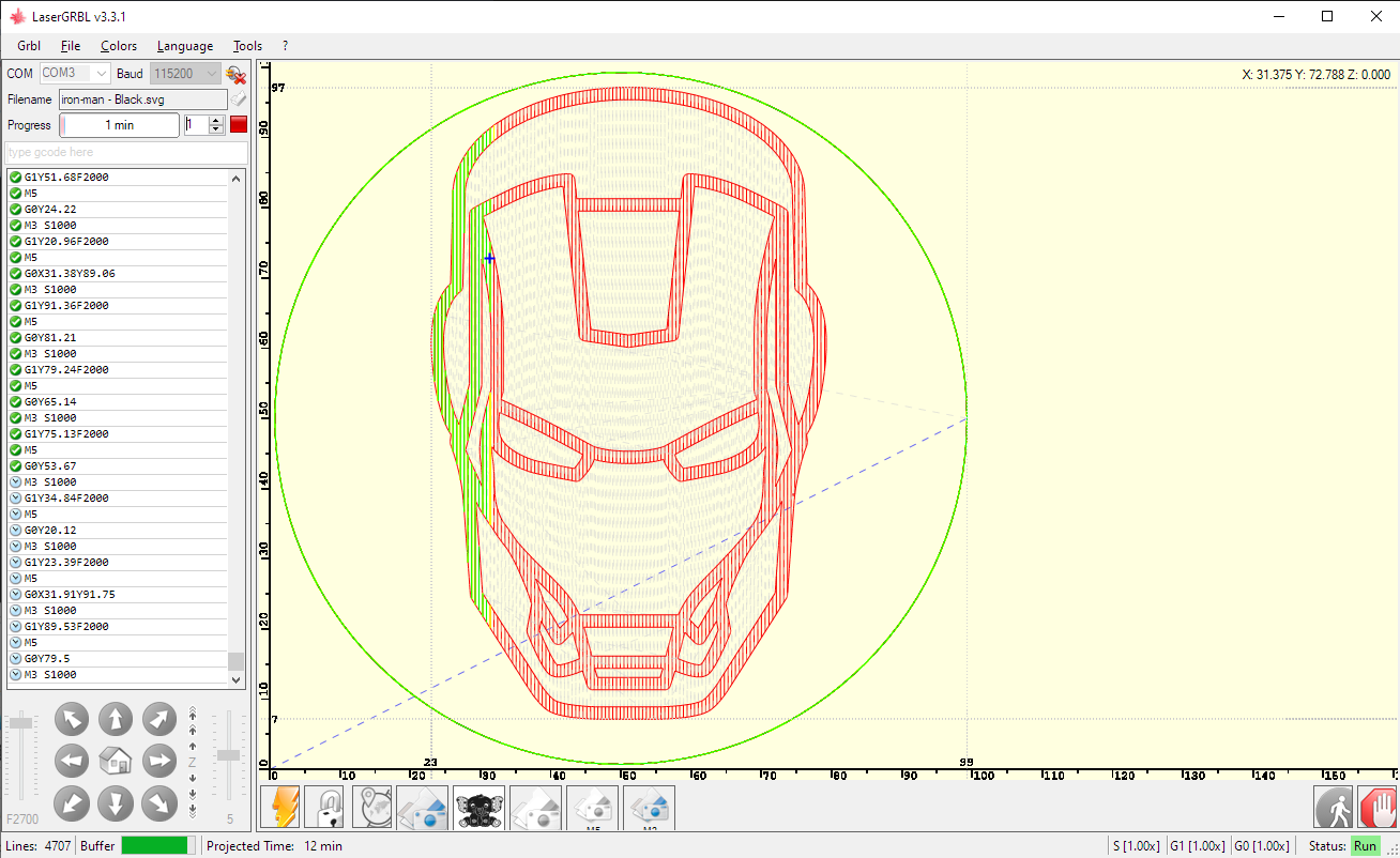 LaserGRBL 使用 GDI+ 绘制预览。GDI+ 的性能不是那么快,允许在短时间内重绘复杂图像,因此执行实时进度绘制不是那么容易。 但是,如果您想尝试一些事情,请随时对文件 GrblPanel.cs 进行更改 该函数 |