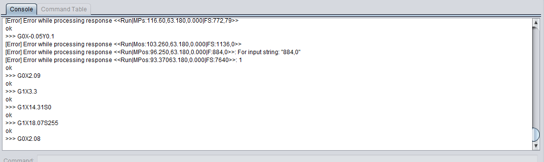 关闭 Mikron007 开启了这个问题 2020 年 9 月 12 日 · 6条评论 关闭 奇怪地从 GRBL v1.1 接收到“ok”#1665 Mikron007 开启了这个问题 2020 年 9 月 12 日 · 6条评论 注释 米克朗007 评论了 2020 年 9 月 12 日 嗨 ,我给自己做了一个激光雕刻机,它在随机位置停止工作,但通信保持开放。 从 LightBurn 软件控制台,我注意到从控制器接收到奇怪的信息。我正在使用 Arduino Uno GRBL 防护罩。 我将 USB 电缆更换为较短的电缆(约 0.5 m 屏蔽电缆),但这并没有解决我的问题。 我添加了我的问题的图片。 作者 米克朗007 评论了 2020 年 9 月 14 日 现在我正在尝试 Universal Gcode Sender – UGS,我得到了类似的结果。激光仍会在作业中途停止。 Mikron007 改标题 奇怪地从 marlin v1.1 接收到“ok” 奇怪地从 GRBL v1.1 接收到“ok” 2020 年 9 月 14 日 朗瓦特 评论了 2020 年 9 月 15 日 设置? 作者 米克朗007 评论了 2020 年 9 月 15 日 设置? 我的 grbl 设置是: $0=10 $1=25 $2=0 $3=0 $4=0 $5=0 $6=0 $10=1 $11=0.010 $12=0.002 $13=0 $20=0 $21=0 $22=0 $23=0 $ 24 = 25.000 $ 25 = 500.000 $ 26 = 250 $ 27 = 1.000 $ 30 = 255 $ 31 = 0 $ 32 = 1 $ 100 = 100.000 $ 101 = 100.000 $ 10.000 $ 102 = 250.000 $ 110 = 6000.000 $ 111 = 6000.000 $ 112 = 6000.000 $ 112 = 6000.000 200.000 $131=200.000 $132=200.000 terjeio 评论了 2020 年 9 月 15 日 一些 Arduino 克隆有一个糟糕的 USB <> UART 芯片?有丢失的字符值得调查吗? 作者 米克朗007 评论了 2020 年 9 月 15 日 一些 Arduino 克隆有一个糟糕的 USB <> UART 芯片?有丢失的字符值得调查吗? 谢谢。我有一个来自 Keyestudio 的 arduino。我会试试那个。 作者 米克朗007 评论了 2020 年 9 月 27 日 看来更换arduino uno板解决了这个问题。 谢谢。 Mikron007已完成 关闭 2020 年 9 月 27 日 喜欢 (0) 为小型雕刻导入图像 #227 打开 DXF 文件 #228 v1.3.8-EDGE 重启后键盘快捷键消失 #427 关闭 无法在 gsender 1.2.0 中打开 .gcode 文件 #367 RaspberryPi 运行 gsender 时出现问题 #89 向 fluidnc 发送 $$ 会导致 gsender 崩溃 #473 v1.3.8-EDGE 重启后键盘快捷键消失 #427 关闭无法在 gsender 1.2.0 中打开 .gcode 文件 #367RaspberryPi 运行 gsender 时出现问题 #89向 fluidnc 发送 $$ 会导致 gsender 崩溃 #473功能请求:抑制发送到机器的 gcode 中的 gcode 注释。 #444 关闭通过网络连接进行连接 #171操纵杆运动的剩余问题 #204 关闭新版本认为我的机器一直处于锁定状态 #474 关闭
