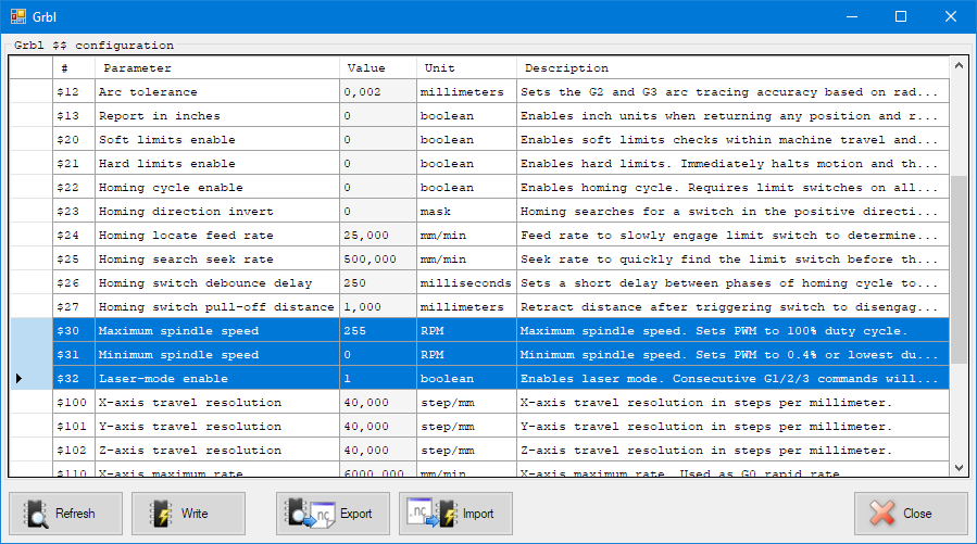 这听起来可能是新激光器随附的驱动程序有问题。我过去也遇到过类似的问题。尝试将定时器预分频器更改为 TCCRB 的 1/8 以获得更慢的 PWM。默认值为 7.8 kHz 左右,可以降至 0.98 kHz。详细信息在 grbl 存储库中,而不是此处。谷歌是你的朋友。 |