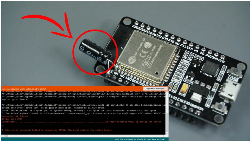 时,仔细检查 Arduino IDE 会提示此错误消息:“无法连接到 ESP32:等待数据包标头超时”