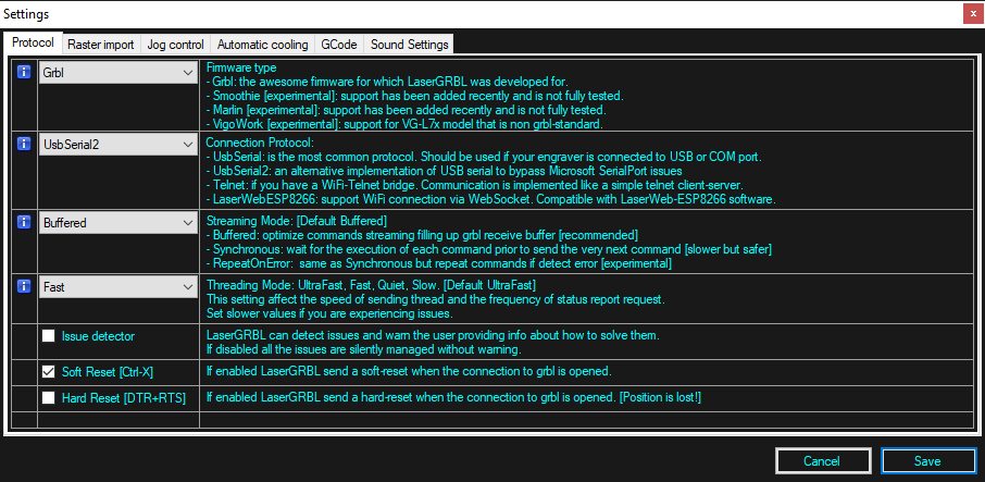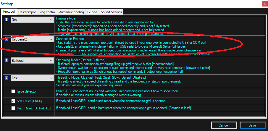 我也在尝试使用 arduino mega 2560,使用 grbl 1.1f mega,我无法使用 lasergrbl 连接,使用 USG 可以连接,可能是什么问题?