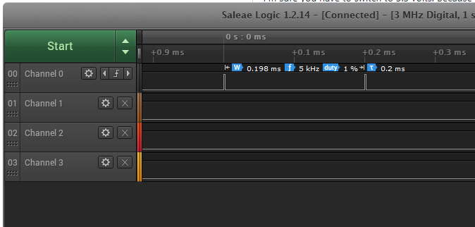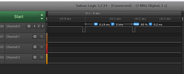 这永远不会达到 +3.3V。看起来好像需要一个上拉电阻。然而,当你用你的仪表电压显示测量值时,可以在示波器中看到明显更高的电压,这让我不相信所有这些最后的测量值。然而,令人惊讶的是,它显示了一个合理的占空比。