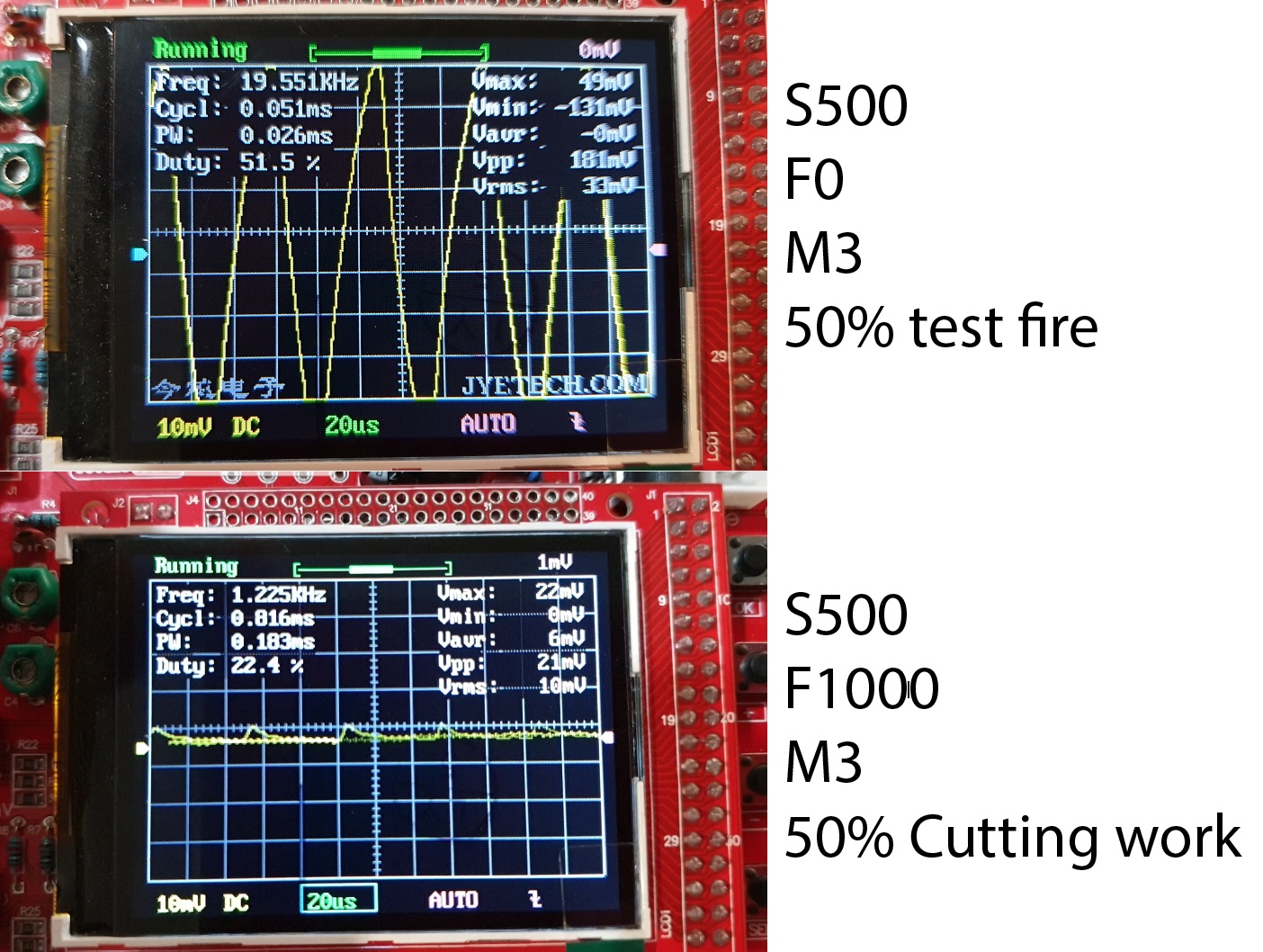 你读过这个页面吗? 它解释了 grbl 的激光模式,以及 M3 / M4 的工作原理。 你对pwm at s1000 / s500的描述没问题。 绘制电路并上传。我们会为您检查。 另外,请确保您的电源足够强大以运行步进电机和具有一些额外容量的控制器。我将 10A 12V 用于 2 nmea 17 步进电机(~ 2A 额定值) |