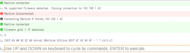 不,这是 LaserWeb 限制 – lasergrbl 在 telnet 上运行良好(https://github.com/bdring/Grbl_Esp32/wiki/Using-Telnet) 我正在检查在 telnet grbl_esp32 中添加此欢迎字符串的影响 |