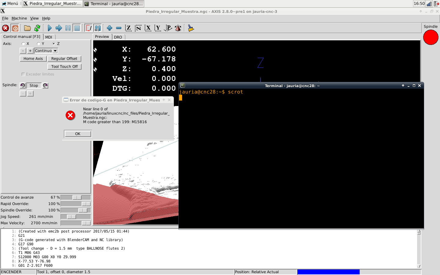 我可以在当前的 master 提示 (v2.8.0-pre1-3126) 上重现它,但它不会在 2.7.8 上发生。我正在从我们的 2.6 或 2.7 Live/Install ISO 安装的 32 位 x86 VM 上进行测试。 在 2.7 和 master 上,Status 报告的活动 mcodes,在中止大程序之后以及在尝试加载 3D_Chips.ngc 之后立即是:“M3 M9 M48 M53 M0”。 |