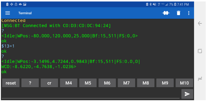 关闭 mac7988 开了这个issue 2019 年 4 月 29 日 · 5 条评论 关闭 安卓蓝牙串口只能读取mm中的MPOS和WPOS#133 mac7988 开了这个issue 2019 年 4 月 29 日 · 5 条评论 注释 mac7988 评论了 2019 年 4 月 29 日 你好, 由于某种原因,它只以毫米为单位报告。我试图改变 $13=1 但没有效果。 所有者 培养 评论了 2019 年 4 月 29 日 这对我来说可以。您是否在 USB/串行和蓝牙的简单终端中尝试过? 这是我手机通过蓝牙的屏幕截图。 作者 mac7988 评论了 2019 年 4 月 29 日 嗨, 我正在使用 can silicone 的 grbl 控制器,似乎无论我做什么都不会改变它。 也许是应用程序。 感谢您尝试帮助我! 干杯! 所有者 培养 评论了 2019 年 4 月 29 日 我也使用 Grbl Controller 进行了测试。很好。在终端上截屏更容易 所有者 培养 评论了 2019 年 4 月 29 日 也许也可以在那个 repo 上发布问题。 作者 mac7988 评论了 2019 年 4 月 29 日 我想我在使用旧版本的代码。我检查了同样的事情,它似乎与之前报告的小数点有关。我将更新到最新的代码并报告回来。 再次感谢。 bdring完成后 关闭 2019 年 4 月 30 日 喜欢 (0) SD 文件错误 #132 G96 CSS 模式主轴停复 #314 v1.3.8-EDGE 重启后键盘快捷键消失 #427 关闭 无法在 gsender 1.2.0 中打开 .gcode 文件 #367 RaspberryPi 运行 gsender 时出现问题 #89 向 fluidnc 发送 $$ 会导致 gsender 崩溃 #473 v1.3.8-EDGE 重启后键盘快捷键消失 #427 关闭无法在 gsender 1.2.0 中打开 .gcode 文件 #367RaspberryPi 运行 gsender 时出现问题 #89向 fluidnc 发送 $$ 会导致 gsender 崩溃 #473功能请求:抑制发送到机器的 gcode 中的 gcode 注释。 #444 关闭通过网络连接进行连接 #171操纵杆运动的剩余问题 #204 关闭新版本认为我的机器一直处于锁定状态 #474 关闭