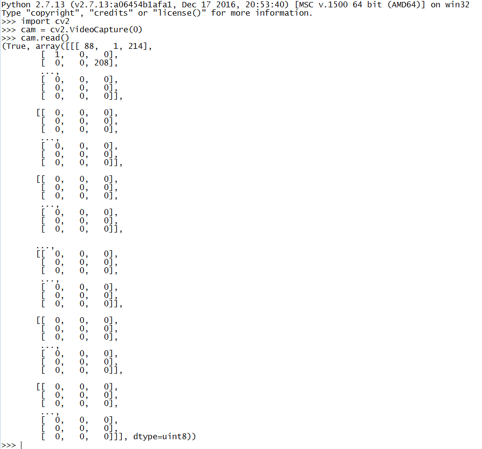 如果我在 bcnc 中打开相机。它只显示了一张黑色图片。 如果我在 python 中执行 cv2.VideoCapture(0).read() 。它给了我以下输出: