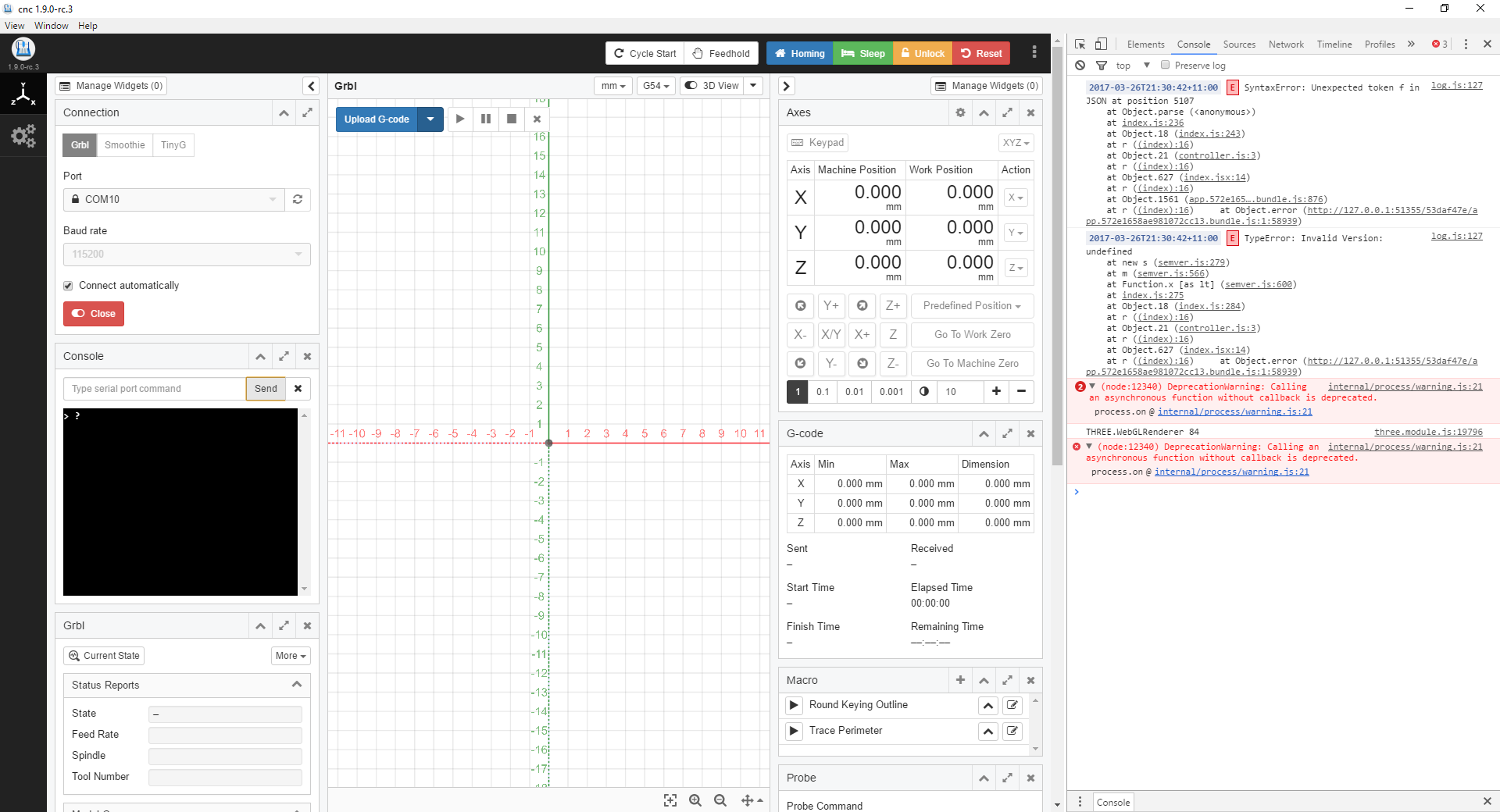 我一直在我的 Raspberry pi 上使用 cncjs V1.8.14,没有任何问题。我想我会在我的 Windows PC 上尝试 V1.9.0 RC,但发现连接到我的 GRBL-Mega V1.1e 时出现问题。我可以选择端口并且波特率是正确的,但是当我连接时,它说它没有连接。状态报告、模态组和队列报告都是空白的。如果我尝试执行命令或慢跑,什么也没有发生。如果我加载一个 gcode 程序并运行它,它会启动,但在发送几行后停止。