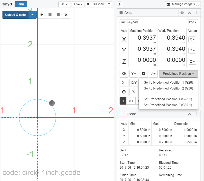 使用 Windows 7 和连接到 TinyG 的 CNCJS 桌面版本 1.9.5。在您运行处于 G20(英寸单位)模式的任何文件之前,设置和使用预定义位置工作正常。之后,当您单击 Goto Predefined 1/2 时,它们会走很长一段路直到崩溃。我不确定这是 TinyG 问题还是 CNCJS。