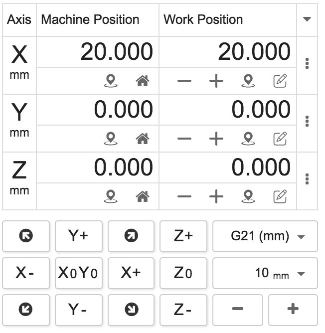 如果我将机器放回原位,机器位置显示屏会按预期显示 0,0,0。如果我然后慢跑到某个位置,比如 X=20 并单击零工作偏移,我看到 G10 L20 P1 X0 按预期发送。但是,显示屏仍然显示 X 工作位置为 20。这不应该是 0 吗?