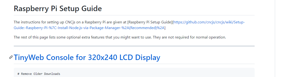 “说明”:具体是哪些?“说明”意味着每个人都同意一组说明,但实际上在这个 repo 的 wiki 中至少有 6 组不同的说明 – 3 组在 Raspberry Pi 安装指南部分和 3 组在安装部分。它们都没有提到版本 4 或版本 7。对版本 4 和 7 的引用在cncjs.org 上古老的 Raspberry Pi 安装指南中。. 所以我的基本观点是有太多相互冲突的指令集。解决方案不是零碎地修复单个集合,而是消除除一组之外的所有集合,并维护该集合。 |