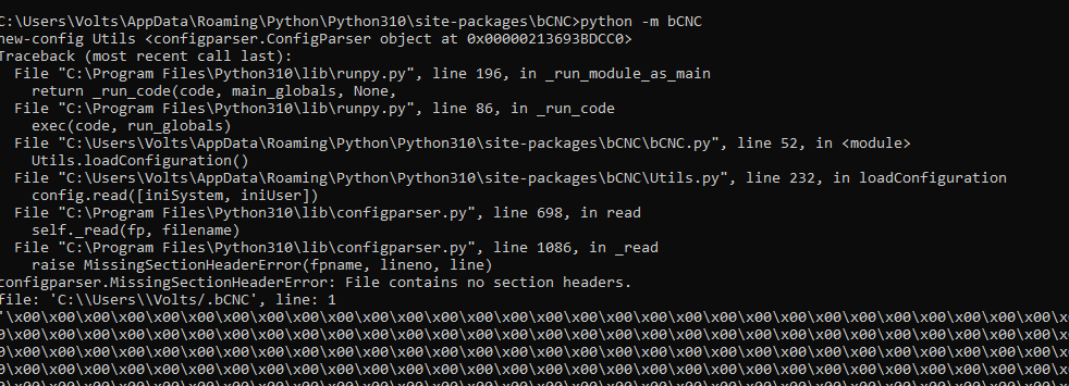 关闭 GabriellJohnny 打开了这个问题 2022 年 11 月 30 日 · 2 条评论 评论 加布里埃尔强尼 评论了 2022 年 11 月 30 日 当我尝试启动程序时,我在提示中收到以下消息,然后它崩溃了 不知道如何修复它,所有模块都已正确安装,这种行为突然开始了。我在 Win10 上运行程序。 贡献者 bgbsww 评论了 2022 年 12 月 15 日 那就是读取配置文件。在 unix 系统上是 ~/.bCNC 和 /bCNC.ini。 在 Windows 系统上,它应该是用户主目录中的 .bCNC,以及安装应用程序的任何位置的 bCNC.ini。这些文件中的一个或另一个已损坏。 查看堆栈区域,它是 c:\Users\Volts/.bCNC,这是您的用户配置文件。删除那个文件,事情应该会重新开始。 作者 加布里埃尔强尼 评论了 2022 年 12 月 26 日 • 编辑 它奏效了,谢谢! GabriellJohnny在完成 时关闭了它 2022 年 12 月 26 日 喜欢 (0) Docker 标签:最新删除。Docker 不再有最新版本 #752 问题队列审查:phew #753 v1.3.8-EDGE 重启后键盘快捷键消失 #427 关闭 无法在 gsender 1.2.0 中打开 .gcode 文件 #367 RaspberryPi 运行 gsender 时出现问题 #89 向 fluidnc 发送 $$ 会导致 gsender 崩溃 #473 v1.3.8-EDGE 重启后键盘快捷键消失 #427 关闭无法在 gsender 1.2.0 中打开 .gcode 文件 #367RaspberryPi 运行 gsender 时出现问题 #89向 fluidnc 发送 $$ 会导致 gsender 崩溃 #473功能请求:抑制发送到机器的 gcode 中的 gcode 注释。 #444 关闭通过网络连接进行连接 #171操纵杆运动的剩余问题 #204 关闭新版本认为我的机器一直处于锁定状态 #474 关闭