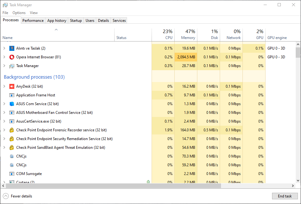 您可以尝试 Process Explorer 看看它是否能为您提供有用的信息。Process Explorer 是一款 Microsoft 工具,类似于功能强大的任务管理器。在我的系统上,有三个 CNCjs 进程。Process Explorer 显示了它们的命令行。顶级进程是单击 CNCjs 图标时启动的主要进程。另外两个具有包含“-type=renderer”和“-type=gpu-process”的命令行。导致窗口出现的是“gpu-process”。如果我杀了那个,窗口就会消失,然后进程重新启动,窗口重新出现。如果我终止“渲染器”进程,窗口保持打开状态但内部变为空白,并且渲染器进程不会自动重启。所以我想知道您的 GPU 是否有 CNCjs 不喜欢的地方。也许驱动程序得到了更新或其他东西。只是猜测。 |