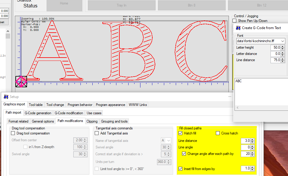 关闭 连枣子 开了这个issue 2020 年 5 月 25 日 · 2 条评论 关闭 轮廓字体填充#124 连枣子 开了这个issue 2020 年 5 月 25 日 · 2 条评论 评论 莲枣子 评论了 2020 年 5 月 25 日 • 编辑 最近在使用绘图软件的时候,发现绘图软件内置了两种字体:1.单线字体2.轮廓字体 能显示中文的字体只有4种:unicode.lff、kst32b.lff、azomix_i.lff、azomix.lff。这4个字体都是我很喜欢的单行字体,但是只能支持部分中文字体。这导致当我输入的中文是不支持的字体时,无法创建正确的gcode。我通过谷歌搜索了一个全面支持中文的字体。这种字体是 wqy-unicode.lff。我用这个字体输入的中文可以正确显示。但是这个字体是轮廓字体。当然,轮廓字体对激光切割很有帮助,所以激光切割使用轮廓字体。但是如果我想用激光雕刻字符,我经常用它来填充字体。所以希望文本生成gcode的接口可以增加大纲填词的选项。这样, 图1是填充轮廓字体的效果 图2是绘图仪软件对轮廓字体的处理结果 连枣子 补充道 增强 标签 2020 年 5 月 25 日 连枣子 改了标题 大纲填词 轮廓字体填充 2020 年 5 月 25 日 所有者 svenhb 评论了 2020 年 7 月 24 日 勾选新选项Hatch fill in new release。 svenhb 添加了 固定 – 需要检查 标签 2020 年 7 月 24 日 作者 莲枣子 评论了 2020 年 7 月 24 日 大纲填词功能非常好用,很棒。 svenhb已完成 关闭 2020 年 7 月 27 日 喜欢 (0) 订单或操作未兑现。 #160 光栅生成按钮坏了 #161 v1.3.8-EDGE 重启后键盘快捷键消失 #427 关闭 无法在 gsender 1.2.0 中打开 .gcode 文件 #367 RaspberryPi 运行 gsender 时出现问题 #89 向 fluidnc 发送 $$ 会导致 gsender 崩溃 #473 v1.3.8-EDGE 重启后键盘快捷键消失 #427 关闭无法在 gsender 1.2.0 中打开 .gcode 文件 #367RaspberryPi 运行 gsender 时出现问题 #89向 fluidnc 发送 $$ 会导致 gsender 崩溃 #473功能请求:抑制发送到机器的 gcode 中的 gcode 注释。 #444 关闭通过网络连接进行连接 #171操纵杆运动的剩余问题 #204 关闭新版本认为我的机器一直处于锁定状态 #474 关闭