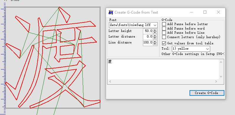 能显示中文的字体只有4种:unicode.lff、kst32b.lff、azomix_i.lff、azomix.lff。这4个字体都是我很喜欢的单行字体,但是只能支持部分中文字体。这导致当我输入的中文是不支持的字体时,无法创建正确的gcode。我通过谷歌搜索了一个全面支持中文的字体。这种字体是 wqy-unicode.lff。我用这个字体输入的中文可以正确显示。但是这个字体是轮廓字体。当然,轮廓字体对激光切割很有帮助,所以激光切割使用轮廓字体。但是如果我想用激光雕刻字符,我经常用它来填充字体。所以希望文本生成gcode的接口可以增加大纲填词的选项。这样,