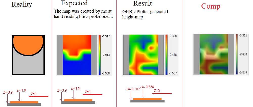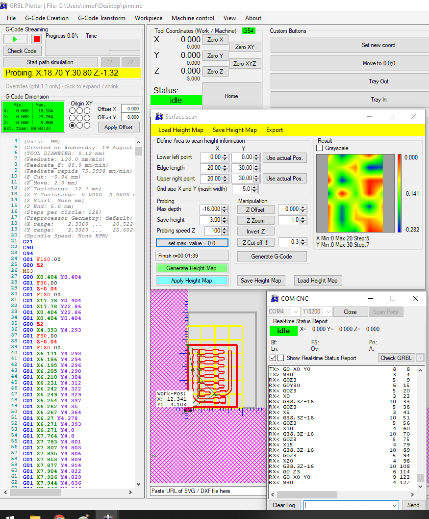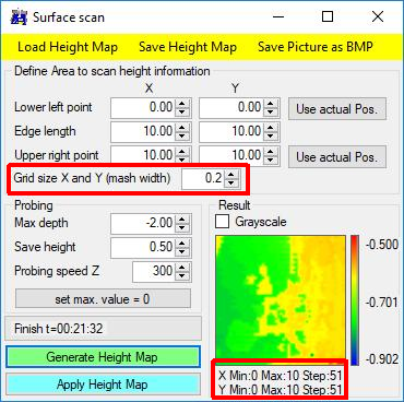 要查看硬币的浮雕,您需要较小的光栅(网格大小),在我的示例中,我使用了 0.2 毫米。您的第一个屏幕截图显示 5 毫米。 主窗口中的消息以机器坐标显示 grbl 的结果。但是扫描窗口重新计算它以工作坐标。 如果不按“设置最大值 = 0.0”,结果图片应该显示从最小深度到最大深度的颜色——通常不是从 0.000 开始。 也许旧扫描仍在内存中且未清除 – 与新扫描重叠(具有最小值。最大值)? 我今晚会检查。 |