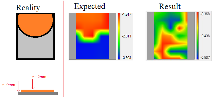 嗨斯文布, 在分析了你的信息后,我又做了一个测试。请看一下随附的视频。 即使光栅为 5 毫米,我仍然希望在桌子和硬币之间看到明显的高度差异,如下图所示(我手动更新了 *.map 文件,其中每个 xy 位置都有相应的 z 值“探测”视图,黄色区域)。 |
