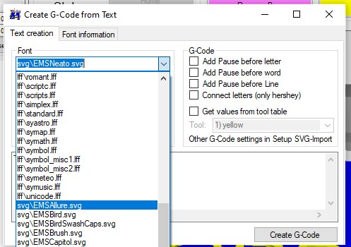 在“从文本创建 G 代码”窗口中,我可以在字体部分(“data\fonts***”)中看到 LibraCad 字体,