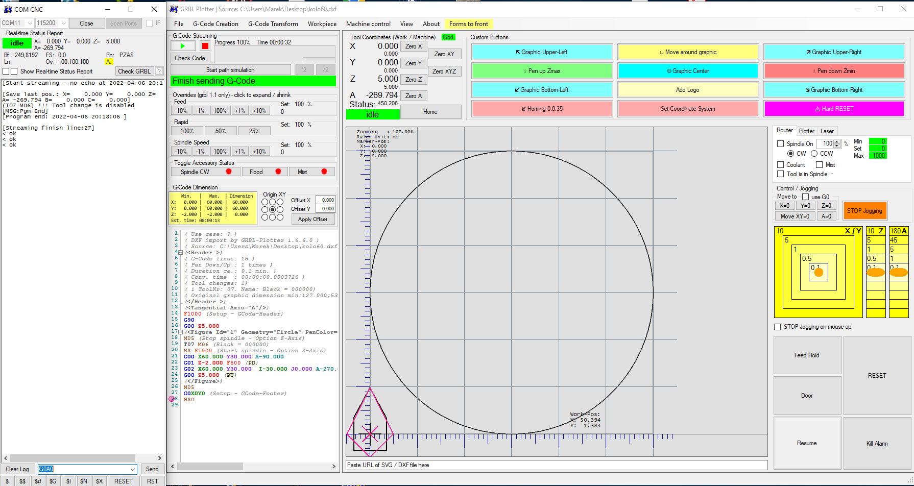 固件 GRBL_LPC G 代码模拟正常工作,刀具在运动过程中切向定位。 G-gode Streaming 无法正常工作。 刀具沿圆周运动,没有切线定位。画好圆后,A轴开始移动 对于矩形,切线刀功能在Simulation和Streaming中都可以正常使用。最后处理_.zip
