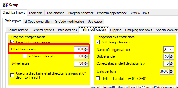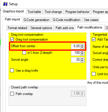 按照建议,我为切线刀操作启用了切线刀和拖刀选项。我从“创建简单形状”创建的 g 代码仍然没有考虑偏移量,并且我得到的 g 代码和图形是完整的因此每次刀被升高和降低时,由于偏移量会出现间隙