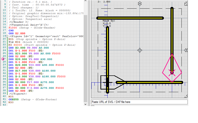 现在我按照上面的正确示例进行了更改,但问题仍然相同,因为该软件没有考虑偏移量。在 GUI 中,线没有断开,因此它旋转并且刀片向下移动并开始切割,而在我的情况下它应该旋转,然后再走一点以补偿偏移,然后才应该降低刀 |