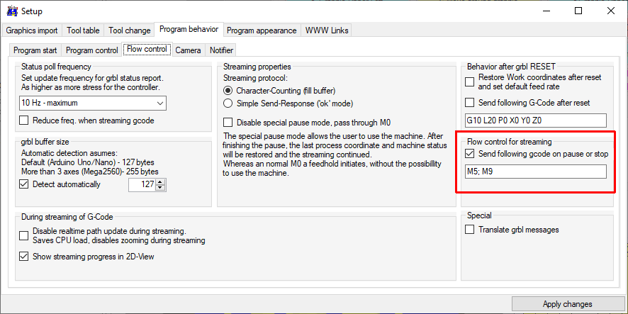 对于向上/向下笔,我有一个由“M03 S50”控制的伺服器,用于向上和“M03 S0”用于向下。