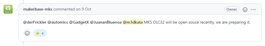 我还想知道源代码何时发布(因为它成为开源的明确承诺是我决定首先切换到 MKS DLC32 的重要部分)。 |