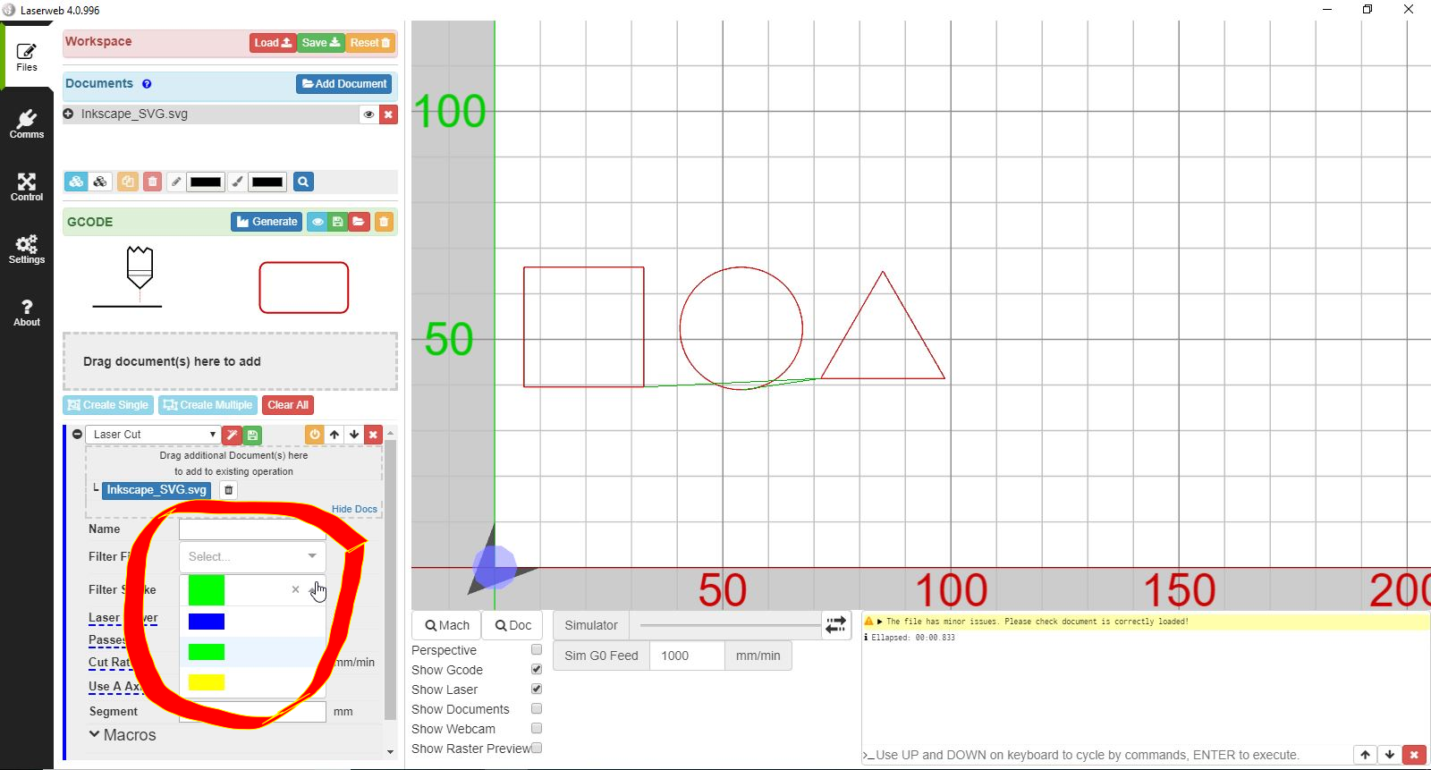 关闭 asasergio 打开了这个问题 2019 年 1 月 4 日 · 3条评论 关闭 “文件有小问题。请检查文件是否正确加载!”,LaserWeb 4.0.996 错误#533 asasergio 打开了这个问题 2019 年 1 月 4 日 · 3条评论 评论 阿萨吉奥 评论了 2019 年 1 月 4 日 • 编辑 Windows 10(64 位) LaserWeb 4.0.996 Inkscape 0.92.3 文件 -> 文档 -> 添加文档… 在“添加文档”之后… 在创建单个 -> 切割率 -> G代码生成 -> 过滤笔划之后… 已尝试使用其他几个 SVG 文件(Inkscape SVG 和 SVG flat)都导致相同的错误。 与Youtube“LaserWeb4 基础知识 – 使用向量”不对应 我做错了什么? 成员 开胃菜 评论了 2019 年 1 月 7 日 我猜你的 SVG 只有填充颜色,但没有描边颜色。首先尝试创建不带过滤器的操作。如果可行,请返回 Inkscape 并检查笔触颜色是否已设置。 作者 阿萨吉奥 评论了 2019 年 1 月 8 日 完美, 我在 Inkscape 生成的图形中包含了笔划,现在我的过滤器可以正常工作,即使 LW4 继续报告错误。 非常感谢。 在 Inkscape 中创建的图形 .svg 可以下载以用于“LW4 基础知识 – 使用向量”教程…… 成员 开胃菜 评论了 2019 年 1 月 8 日 该消息只是一个警告,而不是错误。大多数时候它仍然有效。 cprezzi已完成 关闭 2019 年 1 月 8 日 喜欢 (0) 引出线 #185 限位开关 X + Y #186 v1.3.8-EDGE 重启后键盘快捷键消失 #427 关闭 无法在 gsender 1.2.0 中打开 .gcode 文件 #367 RaspberryPi 运行 gsender 时出现问题 #89 向 fluidnc 发送 $$ 会导致 gsender 崩溃 #473 v1.3.8-EDGE 重启后键盘快捷键消失 #427 关闭无法在 gsender 1.2.0 中打开 .gcode 文件 #367RaspberryPi 运行 gsender 时出现问题 #89向 fluidnc 发送 $$ 会导致 gsender 崩溃 #473功能请求:抑制发送到机器的 gcode 中的 gcode 注释。 #444 关闭通过网络连接进行连接 #171操纵杆运动的剩余问题 #204 关闭新版本认为我的机器一直处于锁定状态 #474 关闭
