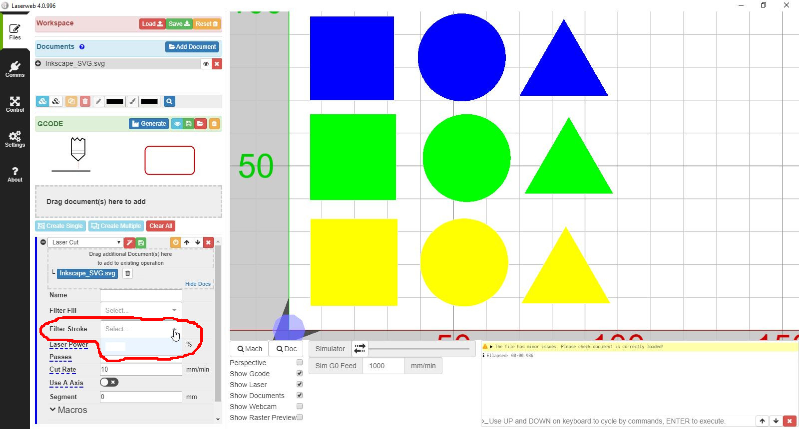 在创建单个 -> 切割率 -> G代码生成 -> 过滤笔划之后…