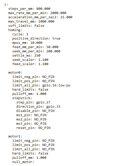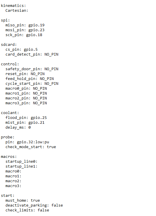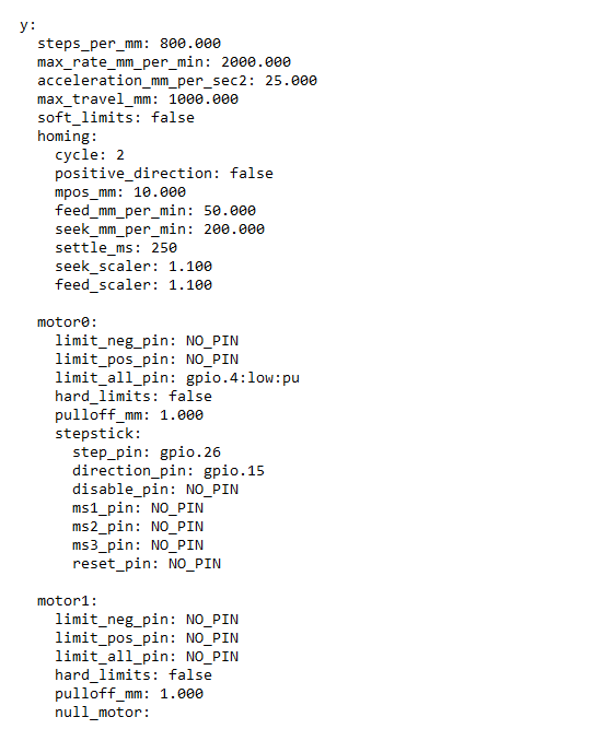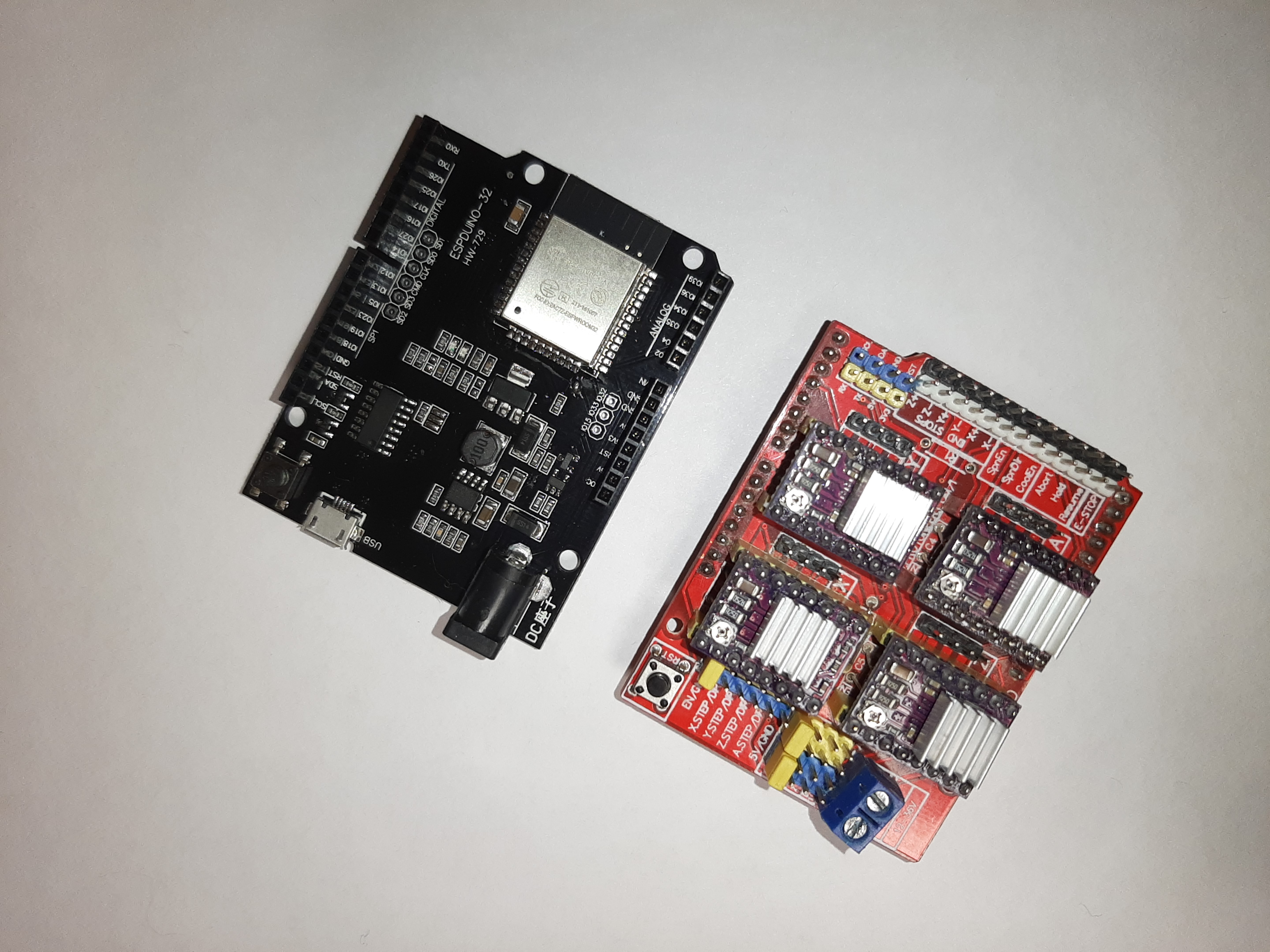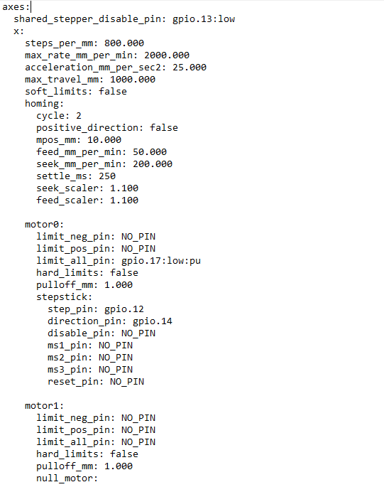 安装了 FluidNC 3.2.8 固件、Wemos D1 R32 ESP32 开发板 (ESPDUINO-32 HW -729)、wifi 和 WebUI 立即启动。一切安好!当连接电机 (NEMA23 2.8A) 并连接(顶部)CNC Shield v3.0 时,X 轴仅在一个方向上正常移动,当我尝试沿相反方向返回时,轴沿原始方向移动。Y 轴和 Z 轴完全没有反应。从 Y 轴更改 X 轴上的引脚,反之亦然不会改变任何内容。这可能是由于 CNC Shield v3.0 上的不同引出线。