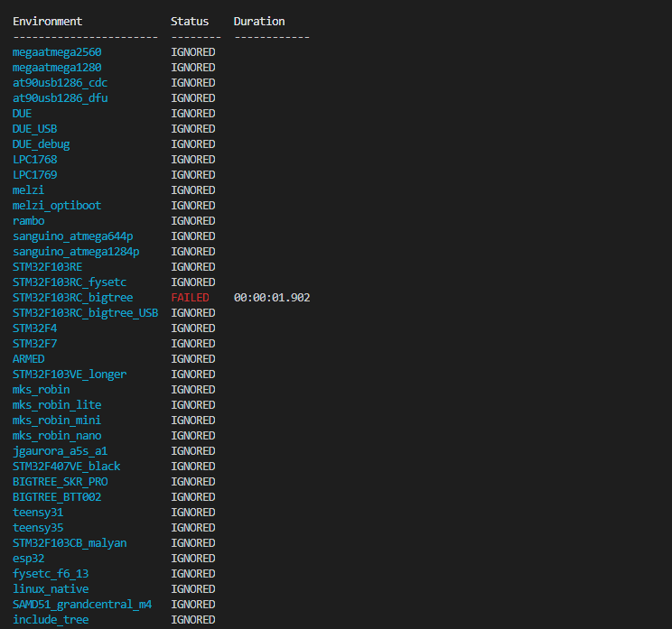 刚刚试过了 – 没有变化。我将我的 platformio.ini 和 config.h 与最新的 BTT 自述文件进行了比较,它们都匹配。我很茫然。我在终端中收到以下警告消息(黄色):FileNotFoundError: [Errno 2] 没有这样的文件或目录:’f:\00 3D PRINTING\3 ENDER 3 pro\SKR mini E3\0 BTT stuff board ver 1.2\github\BIGTREETECH-SKR-MINI-E3-v1.2- with-BLT-endstop\.pio\libdeps\STM32F103RC_bigtree\_tmp_installing-vfds7bdr-package\U8glib-HAL-bugfix\src\clib\HAL_example_files\LCD_I2C_routines.c.example’: