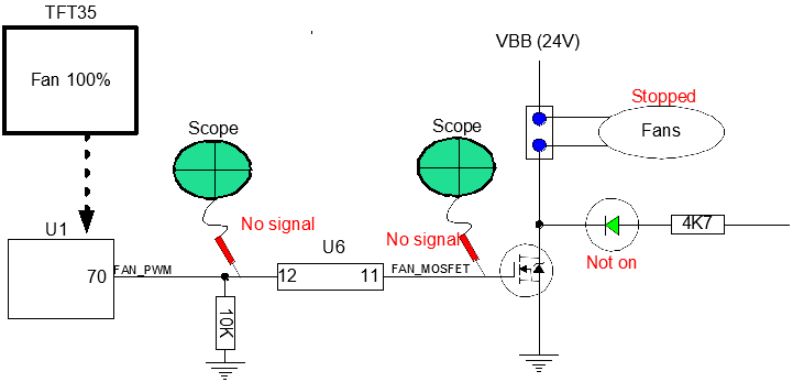当我在等待 TFT35 屏幕交付后首次设置此卡时,我将我打算在 3D 打印机上使用的双风扇连接到 SKR1.4 Turbo 板 FAN0 连接器。然后我使用触摸屏将风扇从 0% 运行到 100%,正是在这样做时,FAN0 控制 mosfet (Q4) 发生故障。查阅此页面,我发现这在 SKR1.4 和 1.4 Turbo 板上很常见。我订购了一些替换 mosfets 并更换了 Q4,但没有任何乐趣。因此,我通过 U6 检查了从 CPU 到 mosfet 栅极的信号,发现在这两种情况下都没有信号,我假设当 mosfet 发生故障时,它允许 24V 电压进入该信号线并将其擦除。 Like many others I gave in and bought another board but before I did I connected my fans to a 24V bench PSU and did scope checks which revealed that my fans produced 9V spikes of 60uS duration about every 2 to 3 mS. As the PL4009 spec is 30V Vds max (and with its very small physical form) it is probably the 9V spike that blows it. I connected a 10uF 20V electrolytic cap |