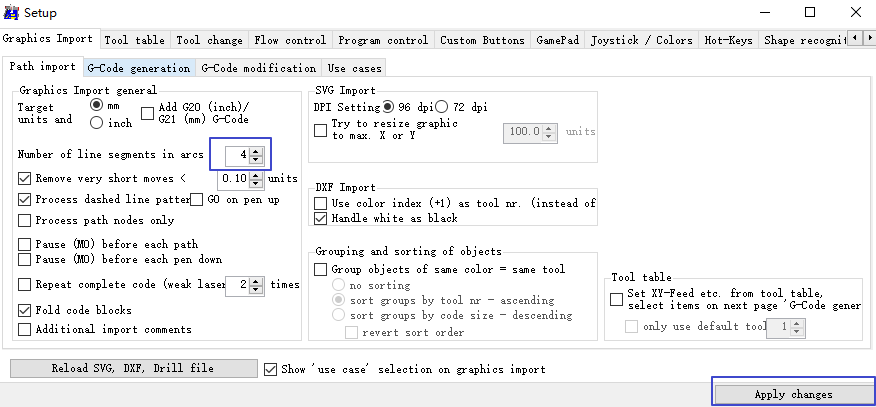 更改任何设置后,您需要重新导入(“重新加载 SVG、DXF”)文件。