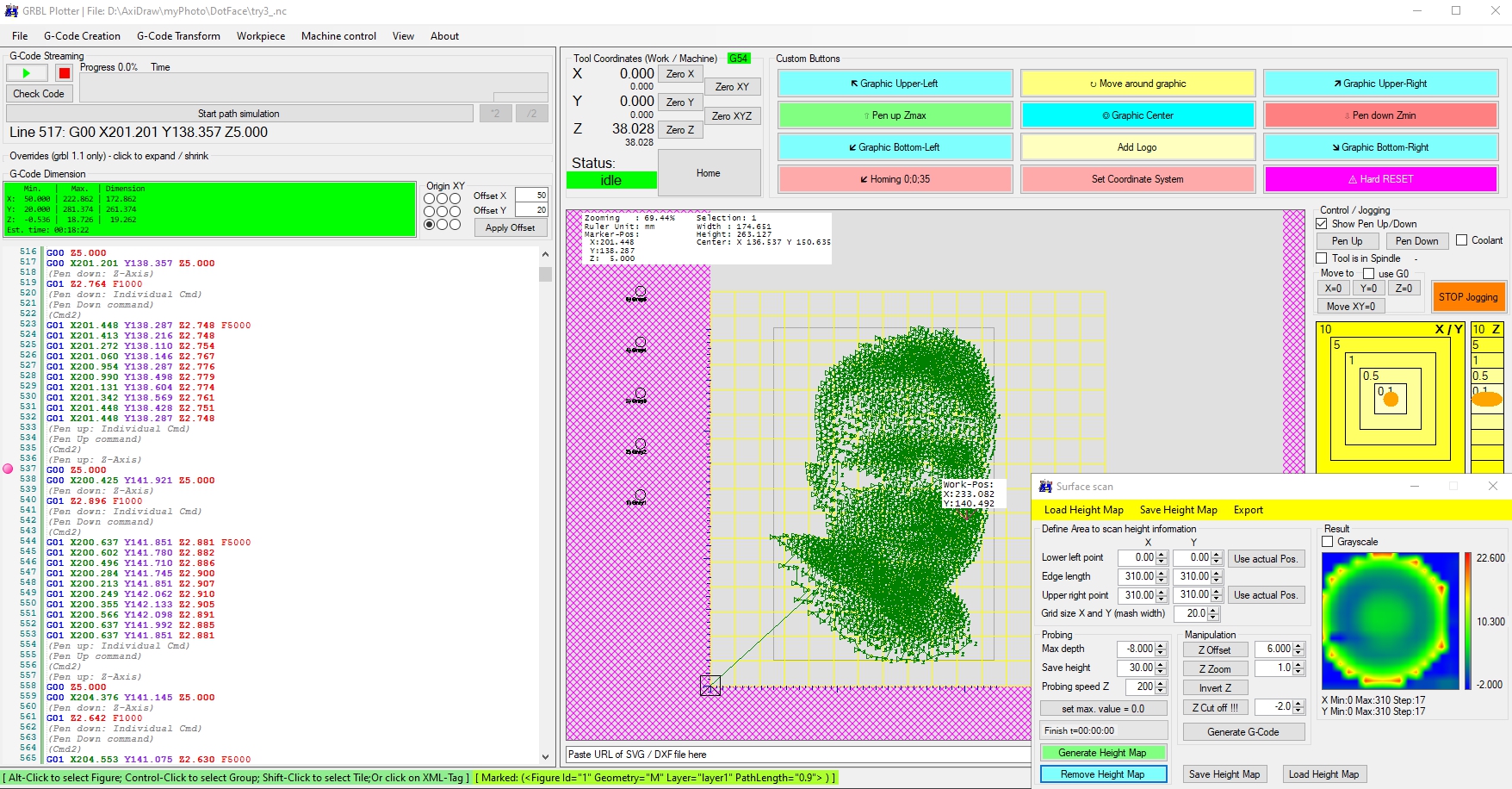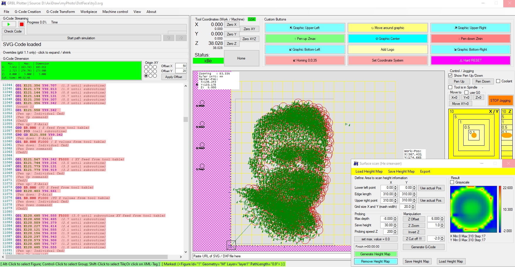 但是发现子路由和向图形添加高度图存在一些问题。 所以在没有子路由(刷刷新)的基本情况下,高度图添加得很好,只需几秒钟 – 但是,当我尝试添加子路由并执行相同的操作时,添加或删除将永远需要,而且永远不会(正如我所见和认为的那样——子路由在图表上显示为圆圈——所以在添加高度图时它也开始为子路由的那些圈子计算高度图,这肯定不需要这样做) 那么有没有办法避免将高度图添加到子路由代码中,或者我如何添加可能是子路由到我创建的现有 gcode正确使用高度图(如第一张图片)? |