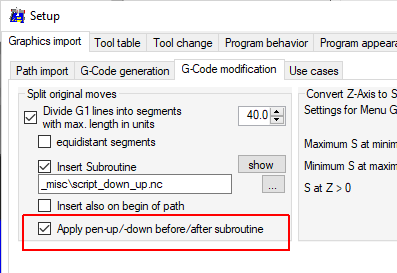 好的,非常感谢。 当来到“调用子路由”时,绘图仪总是转到 Z 安全值是否有办法避免此功能,以便它保持 Z 与原来相同并“调用子路由”。对于点画,它有点令人困惑,因为如果我使用 devide 方法,它会点到同一个地方 2 次,我使用子路由仅用于伺服墨水注入,如: (注入) |